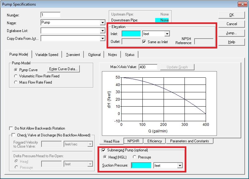 Finally it is worth clarifying the “Elevation” and “NPSH Reference” input, which can be a common point of confusion when modeling a submerged pump. With a submerged pump, the Inlet elevation is typically significantly lower than the Outlet elevation. If you uncheck the option “Same as Inlet” under the Elevation input field, then you will be required to enter an Inlet Elevation, an Outlet Elevation, and an NPSH Reference.